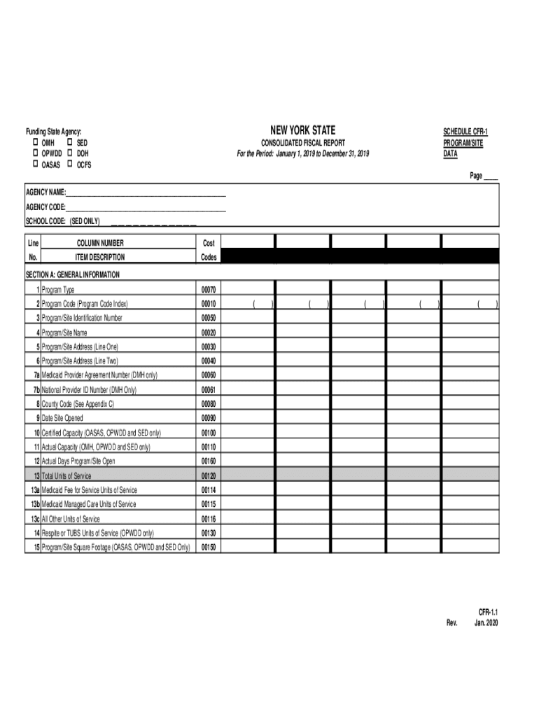 NEW YORK Statementing State Agency: OH USED ODD DOH OASIS OCFSSCHEDULE CFR1 PROGRAM/SITE DATACONSOLIDATED FISCAL REPORT For the Period: January 1, 2019, to December 31, 2019Page ___ AGENCY NAME:___