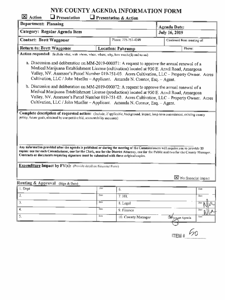 NYE COUNTY AGENDA INFORMATION FORM U Presentation & Actioned Action 5partrnent: PlanningAgenda Date: Food 16, 2019Category: Regular Agenda Item Phone: 7757514249Contact: Brett WaggonerReturn to: Brett