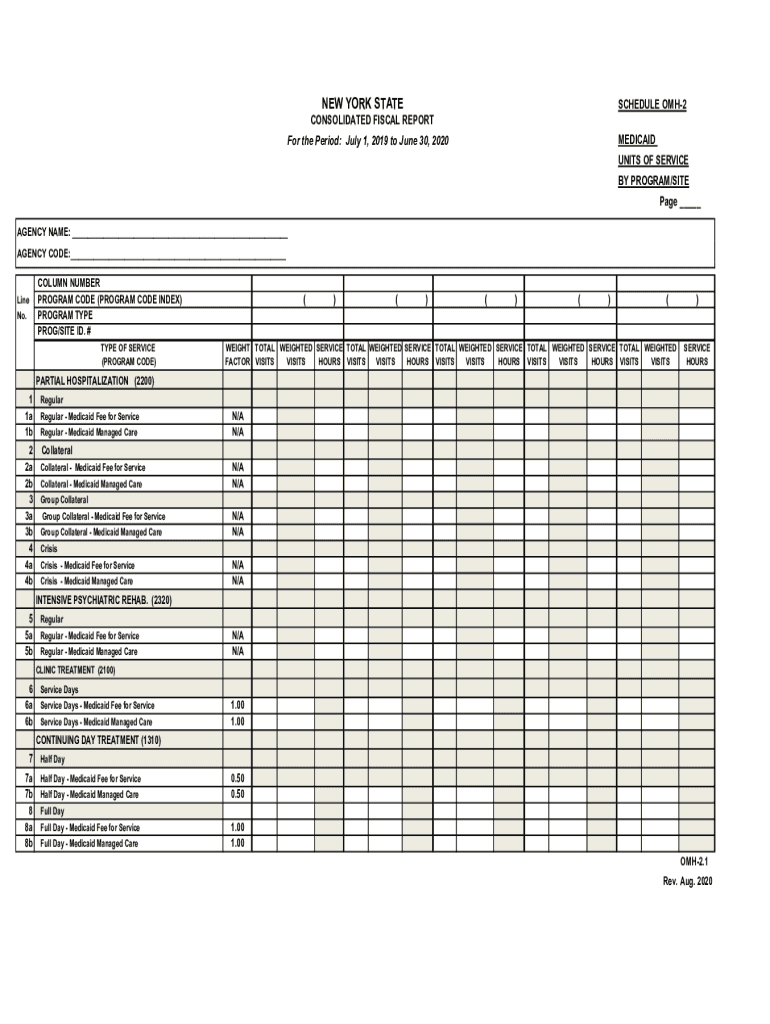NEW YORK STATESCHEDULE OMH2CONSOLIDATED FISCAL REPORTMEDICAIDFor the Period: July 1, 2019, to June 30, 2020UNITS OF SERVICE BY PROGRAM/SITE Page ___ AGENCY NAME: ___ AGENCY CODE:___Line No. COLUMN