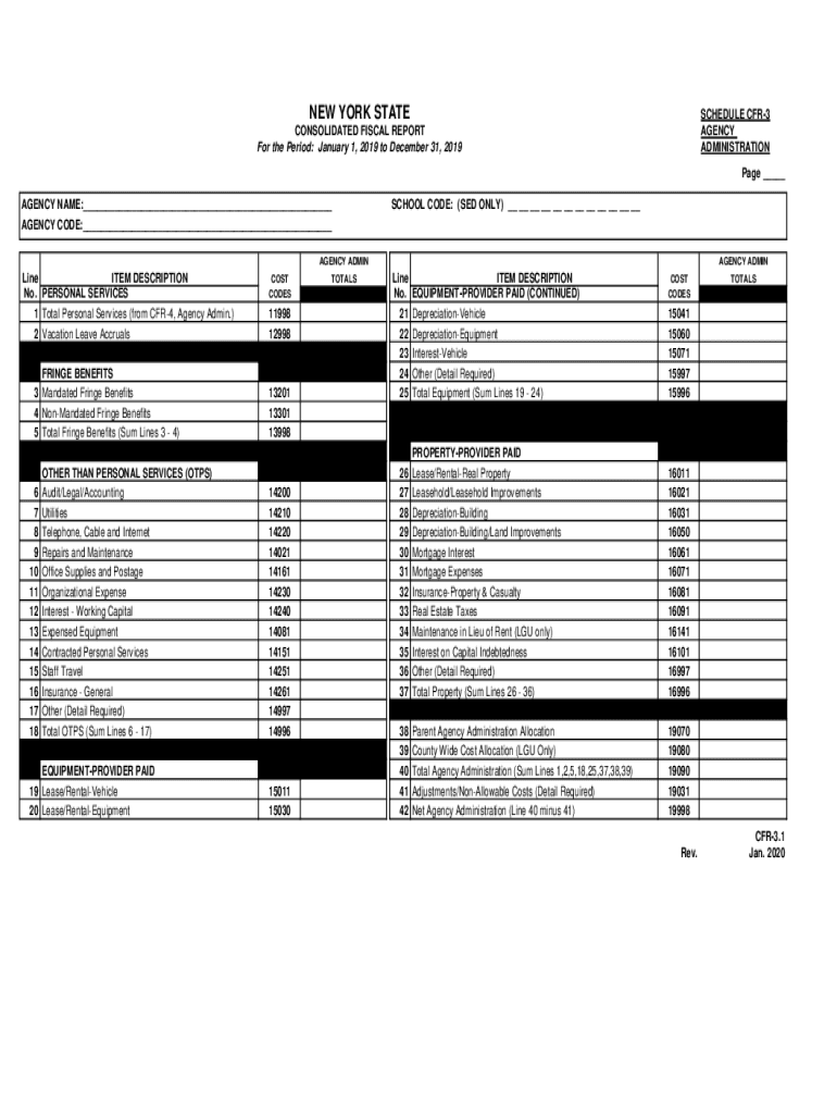 NEW YORK STATESCHEDULE CFR3 AGENCY ADMINISTRATIONCONSOLIDATED FISCAL REPORT For the Period: January 1, 2019, to December 31, 2019Page ___ AGENCY NAME:___SCHOOL CODE: (USED ONLY) __ __ __ __ __ __