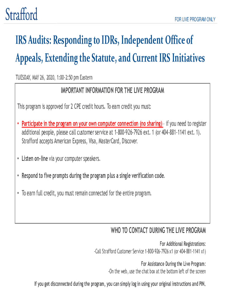 FOR LIVE PROGRAM ONLY IRS Audits: Responding to IRS, Independent Office of Appeals, Extending the Statute, and Current IRS Initiatives TUESDAY, MAY 26, 2020, 1:002:50 pm EasternIMPORTANT INFORMATION
