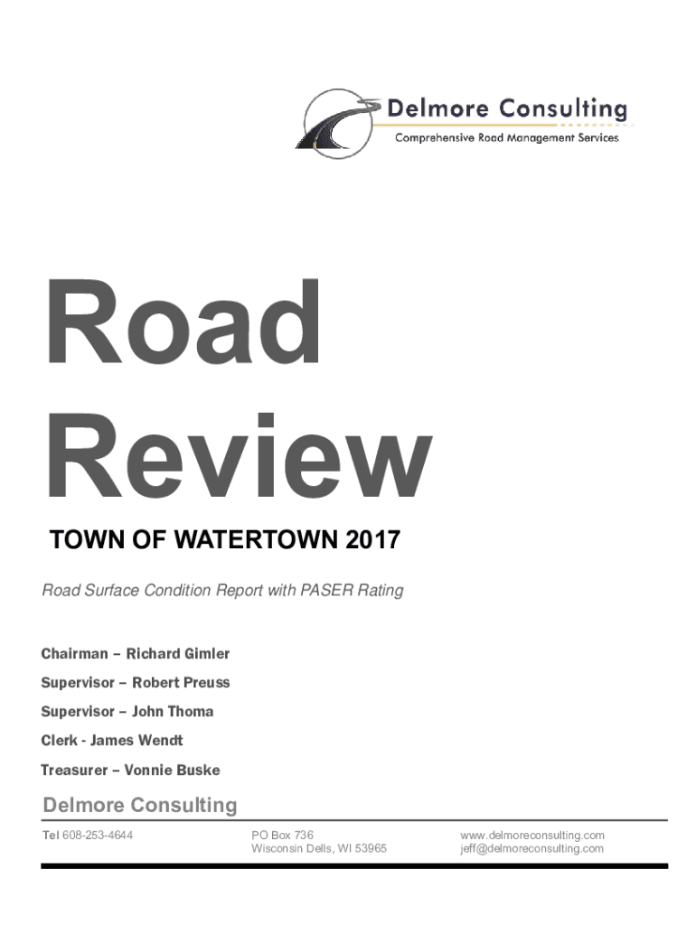 Road Review TOWN OF WATERTOWN 2017 Road Surface Condition Report with PAPER RatingChairman Richard Gimlet Supervisor Robert Press Supervisor John Thomas Clerk James Went Treasurer Ronnie BuskeDelmore