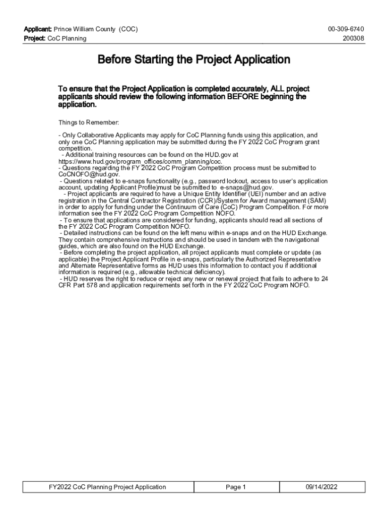Applicant: Prince William County (COC) Project: COC Planning003096740 200308Before Starting the Project Application To ensure that the Project Application is completed accurately, ALL project applicants
