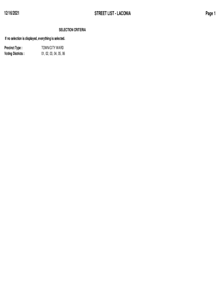 12/16/2021STREET LIST LACONIC SELECTION Criteria no selection is displayed, everything is selected. Precinct Type : Voting Districts :TOWN/CITY WARD 01, 02, 03, 04, 05, 06Page 112/16/2021Generated