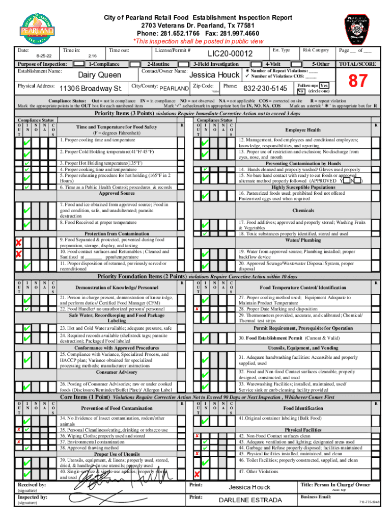 City of Pearland Retail Food Establishment Inspection Report 2703 Veterans Dr. Pearland, TX 77581 Phone: 281.652.1766 Fax: 281.997.4660 *This inspection shall be posted in public view Date:Time in:82522Purpose