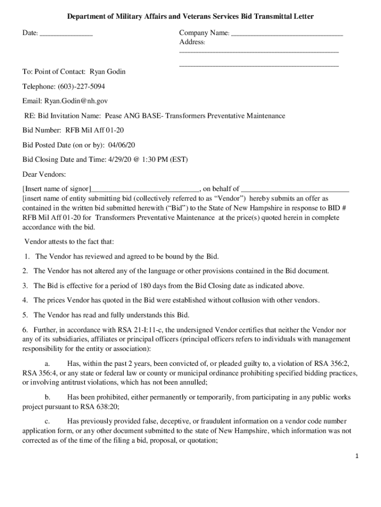 Department of Military Affairs and Veterans Services Bid Transmittal Letter Date: ___Company Name: ___ Address: ______To: Point of Contact: Ryan Odin Telephone: (603)2275094 Email: Ryan.Godin@nh.gov