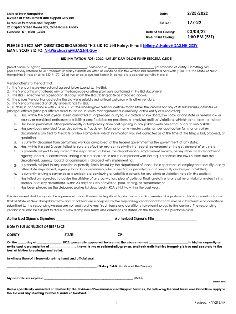 State of New Hampshire Division of Procurement and Support ServicesDate:2/23/2022Bureau of Purchase and Property 25 Capitol Street, Room 102, State House Annexed No.:17722Concord, NH 033016398Date