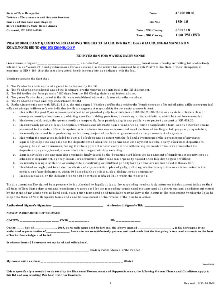 State of New Hampshire Division of Procurement and Support ServicesDate:4/20/2018Bureau of Purchase and Property 25 Capitol Street, State House Annexed No.:18918Concord, NH 033016398Date of Bid Closing: