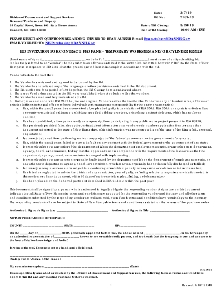 Date: Bid No.:Division of Procurement and Support Services Bureau of Purchase and Property 25 Capitol Street, Room 102, State House Annex Concord, NH 033016398Date of Bid Closing: Time of Bid Closing:3/7/19