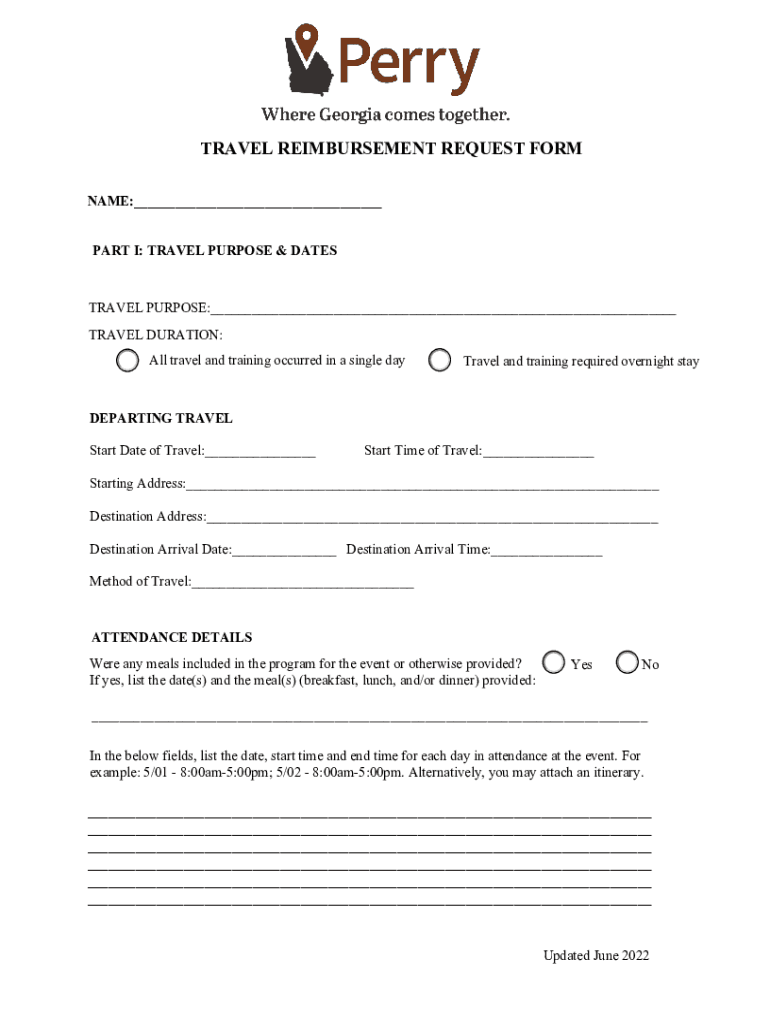 TRAVEL REIMBURSEMENT REQUEST FORM NAME:___ PART I: TRAVEL PURPOSE & DATESTRAVEL PURPOSE:___ TRAVEL DURATION: All travel and training occurred in a single travel and training required overnight stayDEPARTING