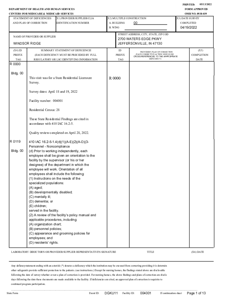 05/13/2022PRINTED: DEPARTMENT OF HEALTH AND HUMAN SERVICESFORM APPROVEDCENTERS FOR MEDICARE & MEDICAID SERVICES STATEMENT OF DEFICIENCIES(X1) PROVIDER/SUPPLIER/LIGAND PLAN OF CORRECTIONIDENTIFICATION