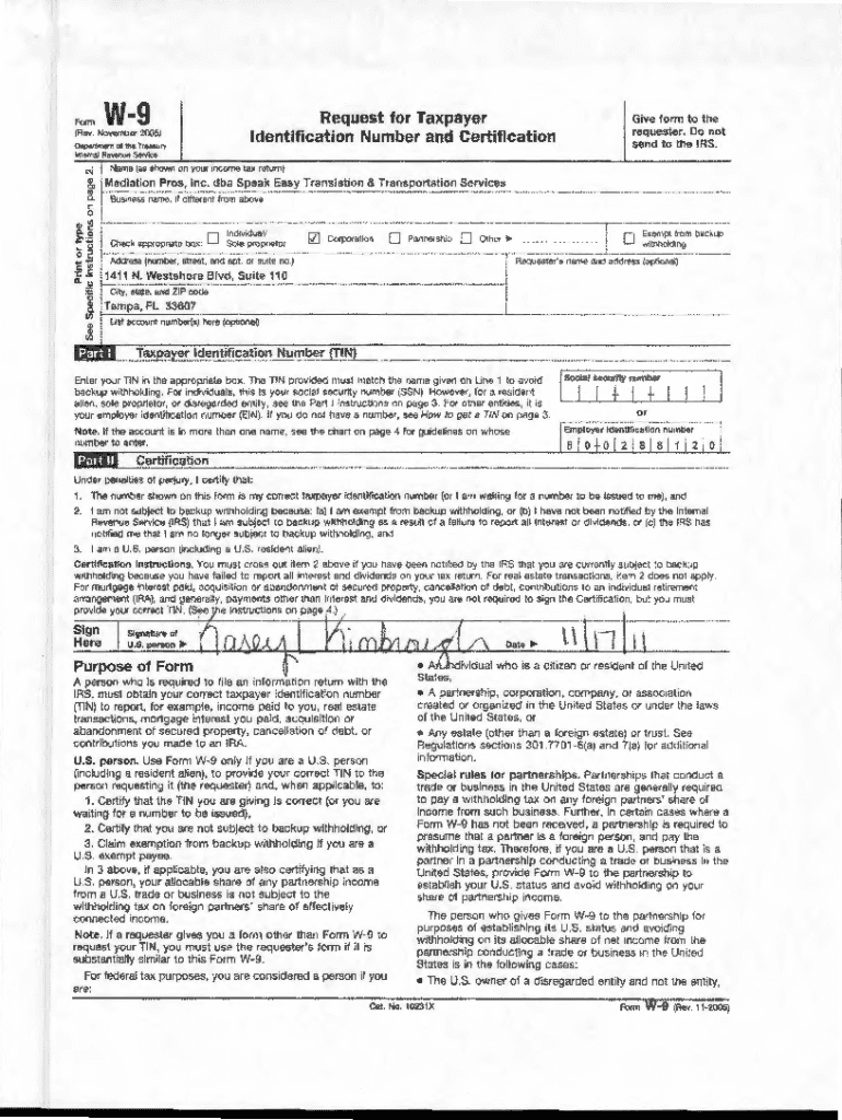 W9Request for Taxpayer Identification Number and CertificationForm (Rev. November 2005) ! Department OT tho Try\”\”\'Give form to the requester. Do not send to the IRS.internal Revenue SGNicecJ