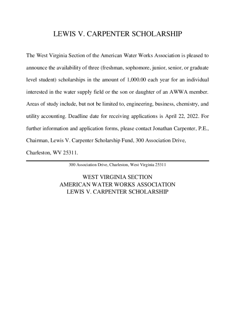 LEWIS V. CARPENTER SCHOLARSHIP The West Virginia Section of the American Water Works Association is pleased to announce the availability of three (freshman, sophomore, junior, senior, or graduate