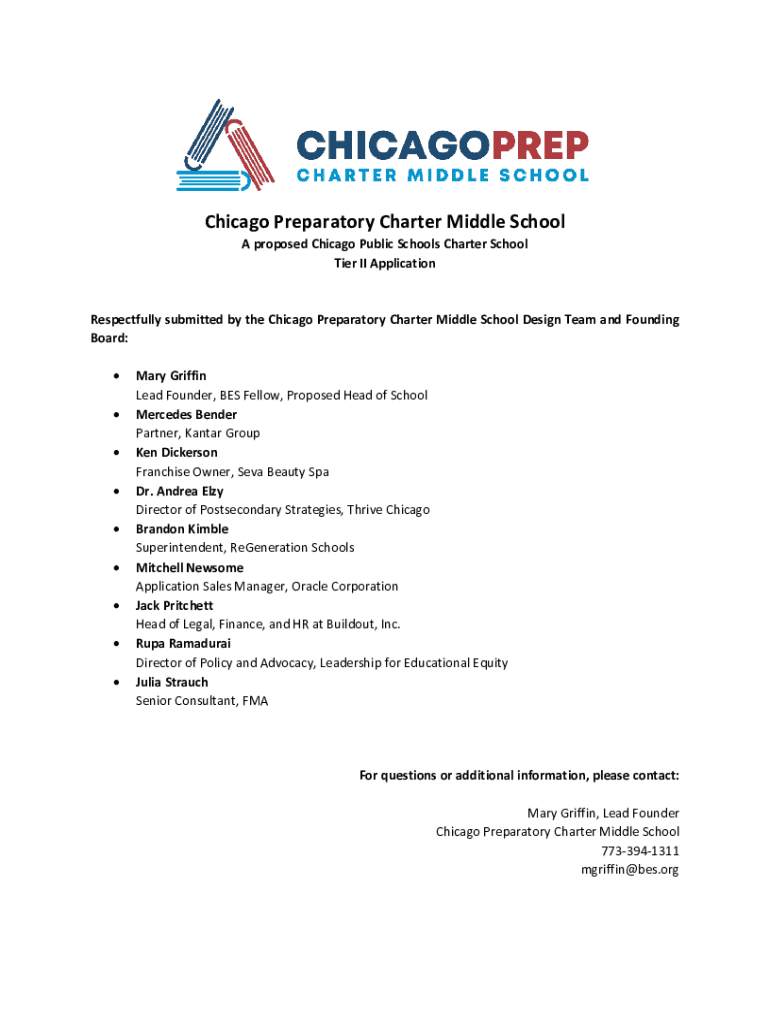 Chicago Preparatory Charter Middle School A proposed Chicago Public Schools Charter School Tier II ApplicationRespectfully submitted by the Chicago Preparatory Charter Middle School Design Team and