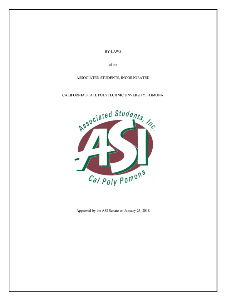 BYLAWS of associated STUDENTS, INCORPORATEDCALIFORNIA STATE POLYTECHNIC UNIVERSITY, POMONAApproved by the AS Senate on January 25, 2018BYLAWS OF THE ASSOCIATED STUDENTS, INC.CALIFORNIA STATE POLYTECHNIC