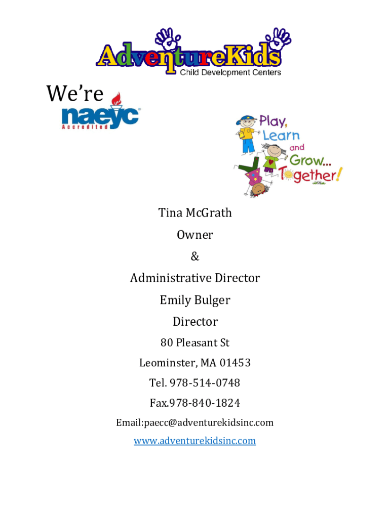 Martina McGrath Owner & Administrative Director Emily Bulge Director 80 Pleasant St Leominster, MA 01453 Tel. 9785140748 Fax.9788401824 Email:paecc@adventurekidsinc.com www.adventurekidsinc.comChilds