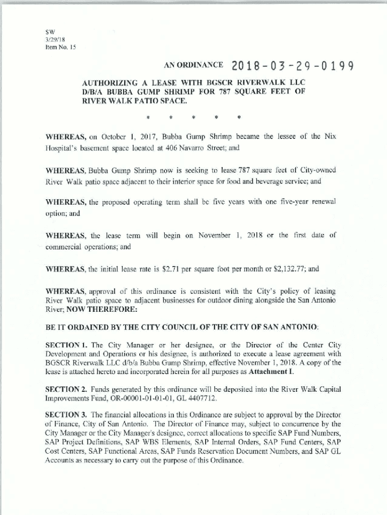 SW 3/29/ 18 item No. 15AN ORDINANCE2Q 1 8 Q3 2 9 Q 1 9 9AUTHORIZING A LEASE WITH BGS CR RIVERBANK LLC D/B/A BUBBA GUMP SHRIMP FOR 787 SQUARE FEET OF RIVER WALK PATIO SPACE. *****WHEREAS, on October