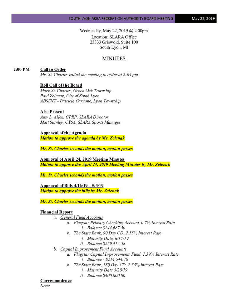 SOUTH LYON AREA RECREATION AUTHORITY BOARD MEETING Wednesday, May 22, 2019 @ 2:00pm Location: CLARA Office 23333 Griswold, Suite 100 South Lyon, MINUTES 2:00 PMC all to Order Mr. St. Charles called