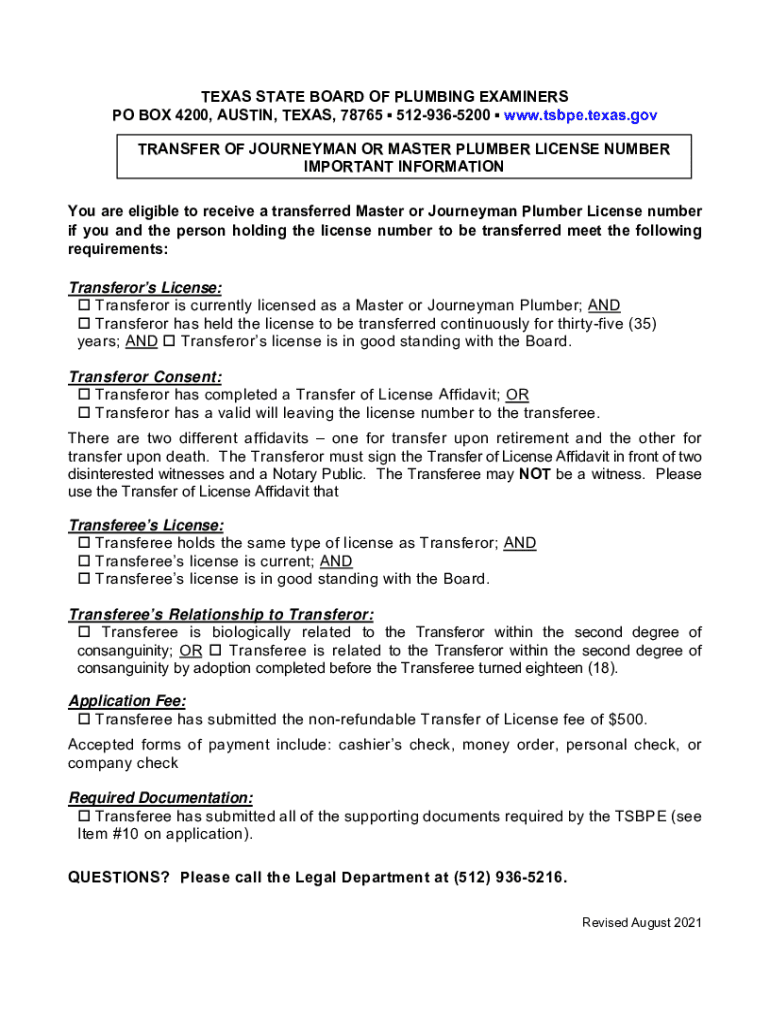 TEXAS STATE BOARD OF PLUMBING EXAMINERS PO BOX 4200, AUSTIN, TEXAS, 78765 5129365200 www.tsbpe.texas.gov TRANSFER OF JOURNEYMAN OR MASTER PLUMBER LICENSE NUMBER IMPORTANT INFORMATION You are eligible