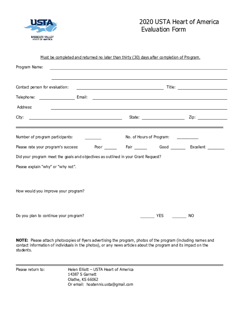 2020 USTA Heart of America Evaluation Foremost be completed and returned no later than thirty (30) days after completion of Program. Program Name:Contact person for evaluation: Telephone:Title: Email:Address: