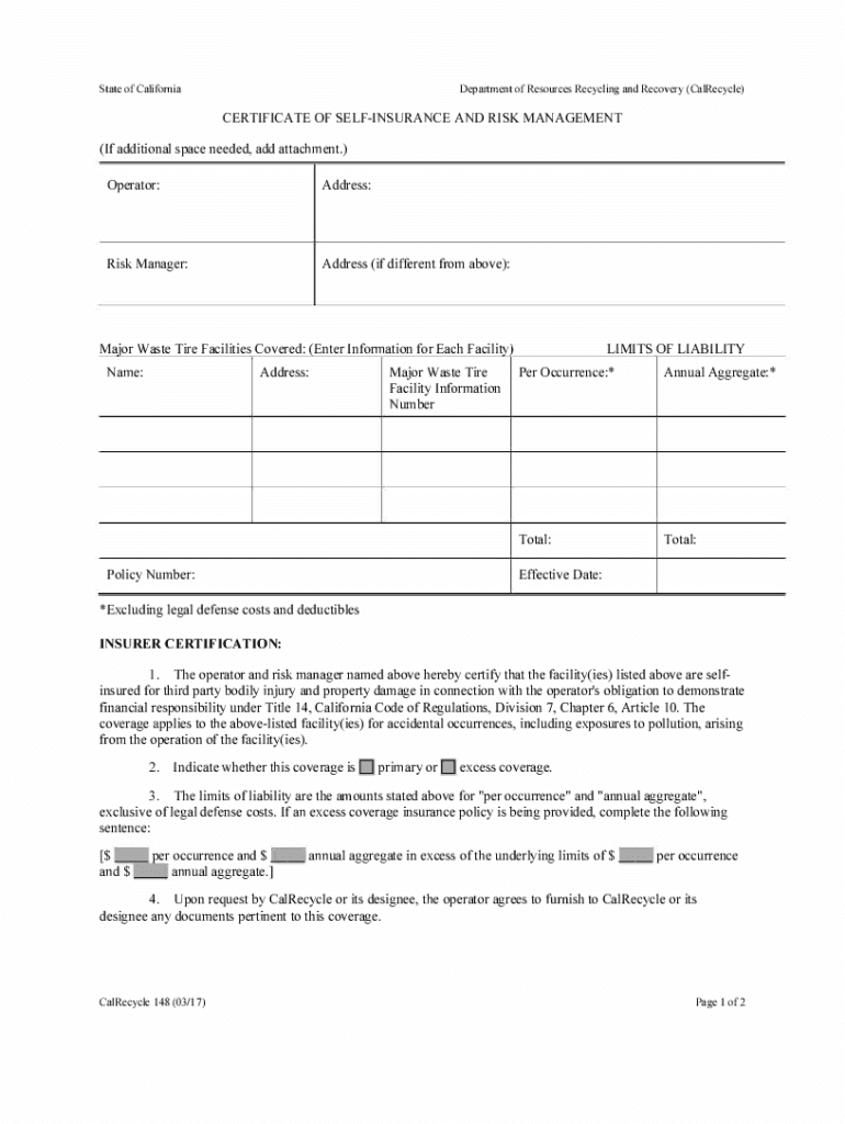 Get the free Certificate of Self-Insurance and Risk Management, CalRecycle 148 (Revised 3/2017). ...