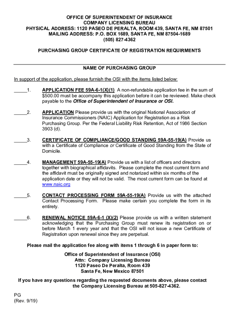 OFFICE OF SUPERINTENDENT OF INSURANCE COMPANY LICENSING BUREAU PHYSICAL ADDRESS: 1120 PASCO DE PENALTY, ROOM 439, SANTA FE, NM 87501 MAILING ADDRESS: P.O. BOX 1689, SANTA FE, NM 875041689 (505) 8274362
