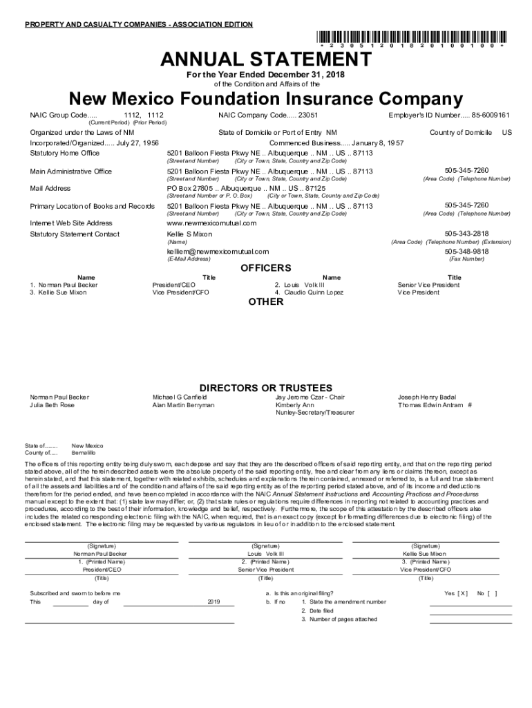 PROPERTY AND CASUALTY COMPANIES ASSOCIATION EDITION×23051201820100100×ANNUAL STATEMENT For the Year Ended December 31, 2018, of the Condition and Affairs of then Mexico Foundation Insurance Company