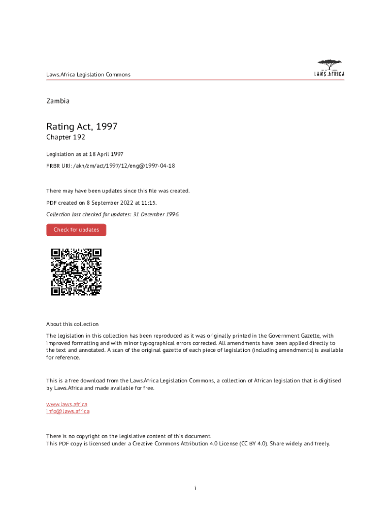 Laws. Africa Legislation CommonsZambiaRating Act, 1997 Chapter 192 Legislation as at 18 April 1997 FRBR URI: /AKN/km/act/1997/12/eng@19970418There may have been updates since this LE was created.