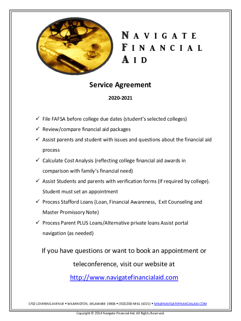 N a v i g a t e F i n an n c i an l A i d Service Agreement 20202021 File FAFSA before college due dates (students selected colleges) Review/compare financial aid packages Assist parents and student
