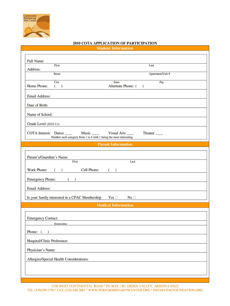 2010 COMA APPLICATION OF PARTICIPATION Student Information Full Name: First Last Street Apartment/Unit # Address: City Home Phone: (State) Zip Alternate Phone: () Visual Arts Theater Email Address: