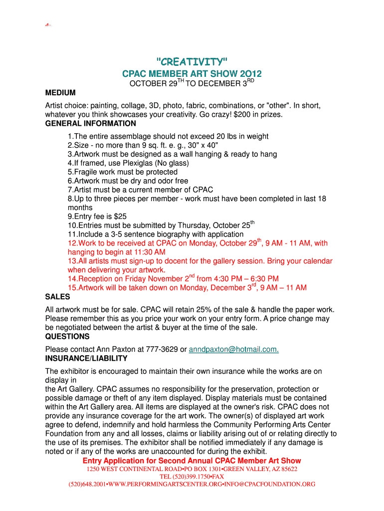 “CREATIVITY CPA MEMBER ART SHOW 2O12 OCTOBER 29 TH TO DECEMBER 3 RD MEDIUM Artist choice: painting, collage, 3D, photo, fabric, combinations, or the “. In short, whatever you think showcases your