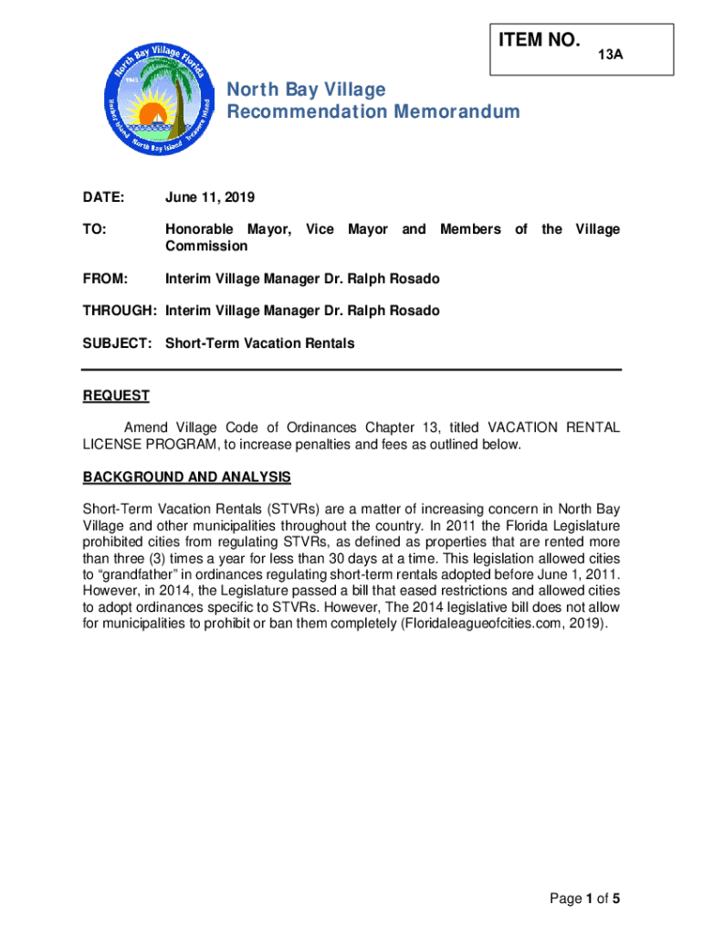 ITEM NO.13ANorth Bay Village Recommendation MemorandumDATE:June 11, 2019TO:Honorable Mayor, Commissioner:Interim Village Manager Dr. Ralph RosadoViceMayorandMembersof the VillageTHROUGH: Interim Village
