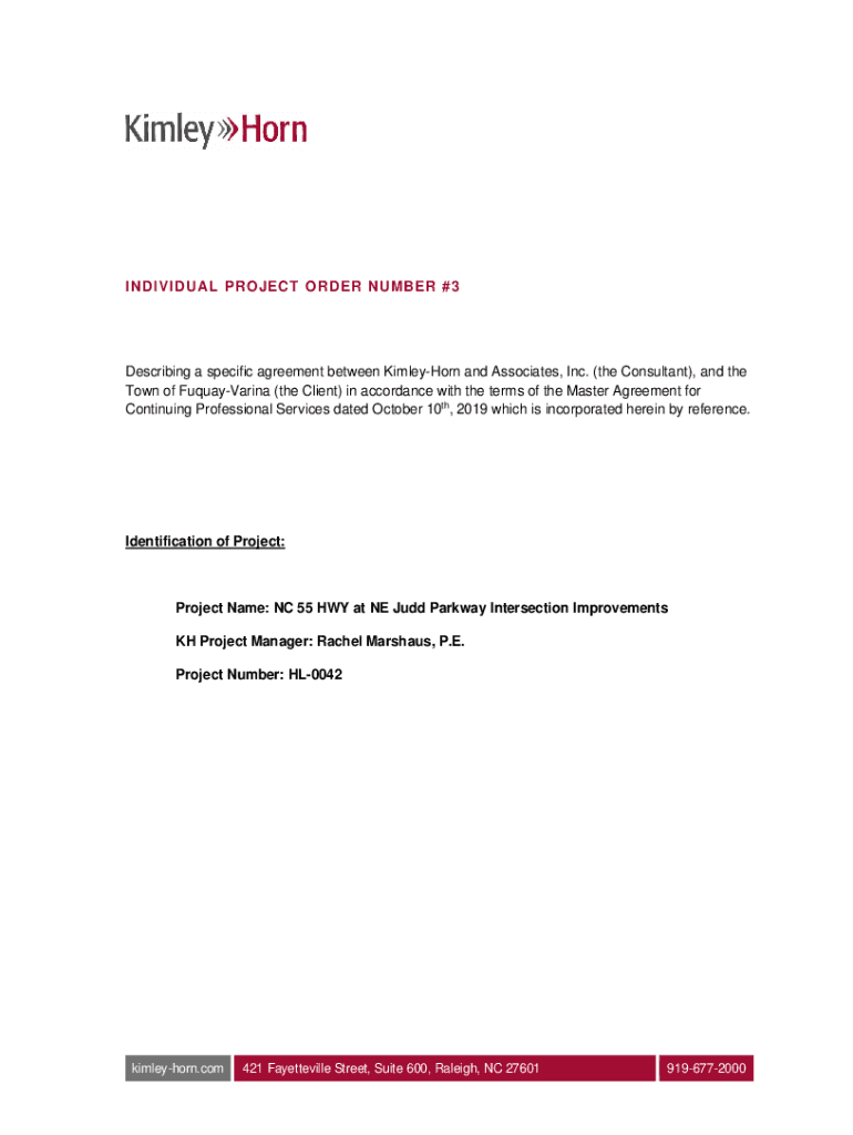 I TDI VI DUAL PRO JET O ORDER SUM BER #3Describing a specific agreement between KimleyHorn and Associates, Inc. (the Consultant), and the Town of FuquayVarina (the Client) in accordance with the terms