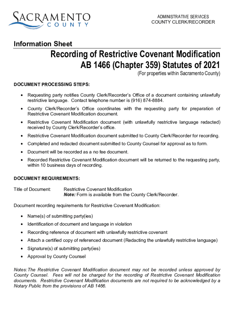 ADMINISTRATIVE SERVICES COUNTY CLERK/RECORDERInformation SheetRecording of Restrictive Covenant Modification AB 1466 (Chapter 359) Statutes of 2021 (For properties within Sacramento County)DOCUMENT