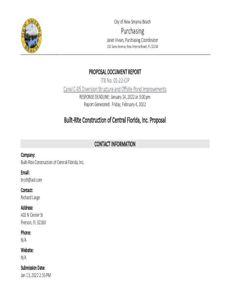 City of New Smyrna BeachPurchasing Janet Vivian, Purchasing Coordinator 210 Sam's Avenue, New Smyrna Beach, FL 32168PROPOSAL DOCUMENT REPORT ITB No. 0122CIP Canal C05 Diversion Structure and Offsite