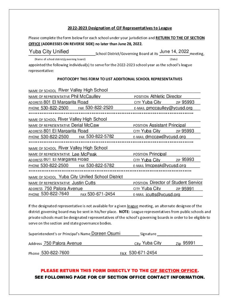 20222023 Designation of CIF Representatives to League Please complete the form below for each school under your jurisdiction and RETURN TO THE CIF SECTION OFFICE (ADDRESSES ON REVERSE SIDE) no later