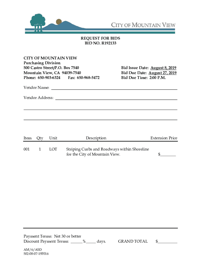 REQUEST FOR BIDS BID NO. R192133 CITY OF MOUNTAIN VIEW Purchasing Division 500 Castro Street/P.O. Box 7540 Mountain View, CA 940397540 Phone: 6509036324 Fax: 6509685472Bid Issue Date: August 8, 2019,