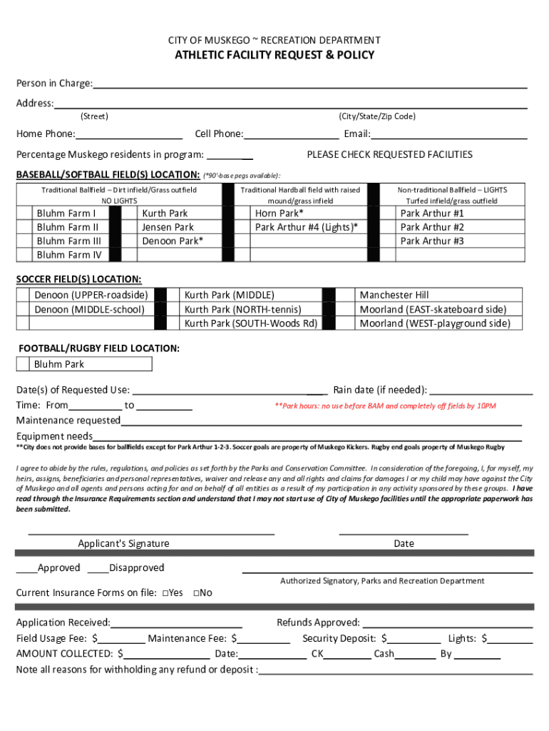 CITY OF MUSKEGON RECREATION DEPARTMENTATHLETIC FACILITY REQUEST & POLICY Person in Charge:___Address:___ (Street)(City/State/Zip Code)Home Phone:Cell Phone:Percentage Muskegon residents in program:Email:_____PLEASE