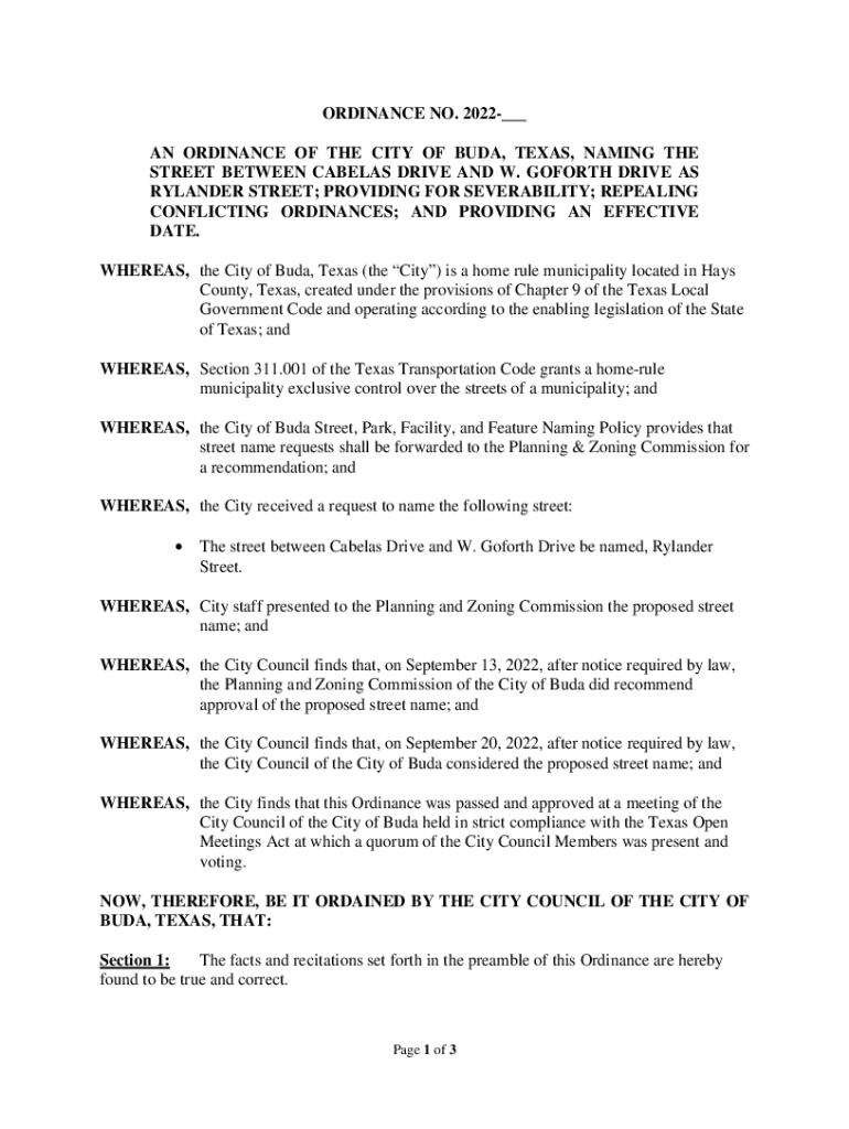 Get the free AN ORDINANCE OF THE CITY OF BUDA, TEXAS, NAMING ...
