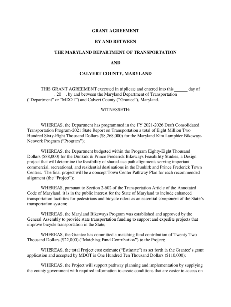 GRANT AGREEMENT BY AND BETWEEN THE MARYLAND DEPARTMENT OF TRANSPORTATION AND CALVERT COUNTY, MARYLAND THIS GRANT AGREEMENT executed in triplicate and entered into this ___, 20__, by and between the