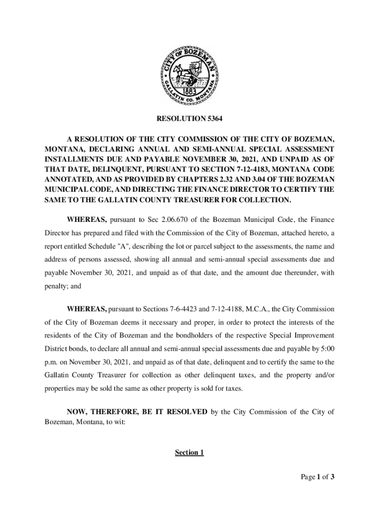 RESOLUTION 5364 A RESOLUTION OF THE CITY COMMISSION OF THE CITY OF BOZEMAN, MONTANA, DECLARING ANNUAL AND SEMIANNUAL SPECIAL ASSESSMENT INSTALLMENTS DUE AND PAYABLE NOVEMBER 30, 2021, AND UNPAID AS