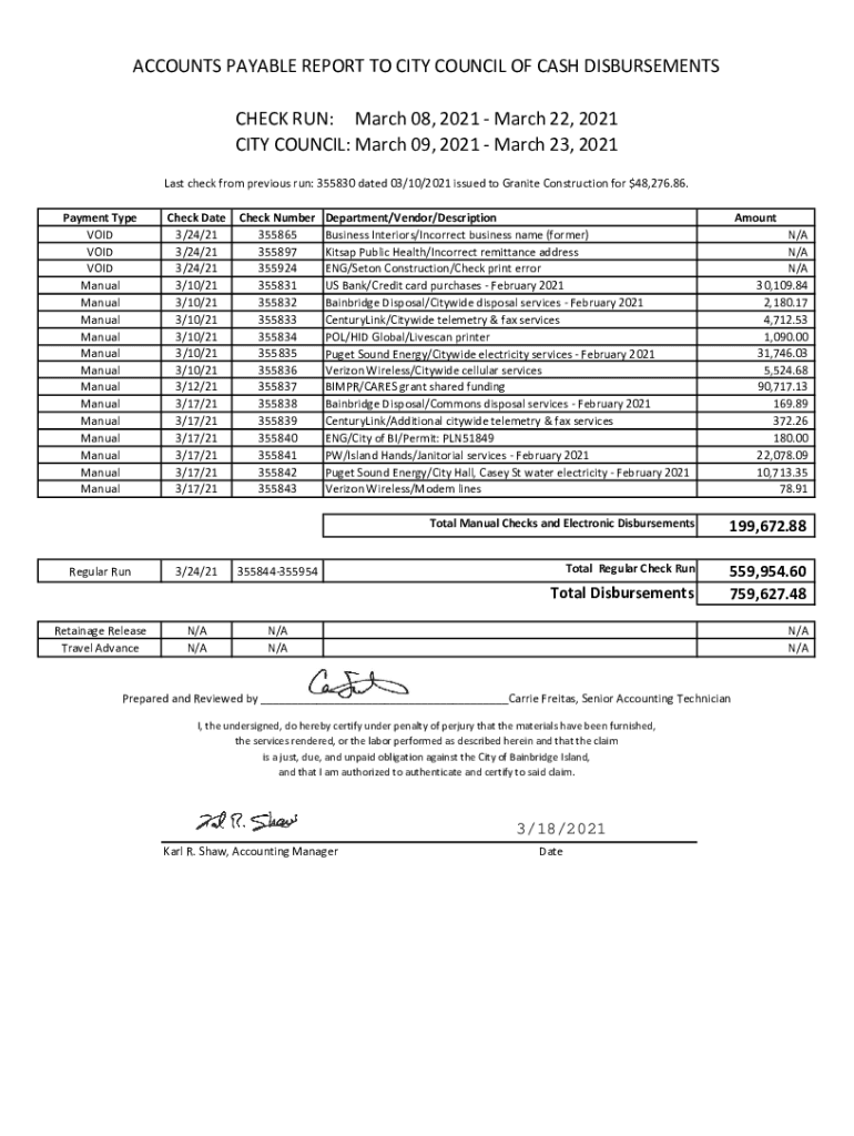 ACCOUNTS PAYABLE REPORT TO CITY COUNCIL OF CASH DISBURSEMENTS CHECK RUN: March 08, 2021, March 22, 2021, CITY COUNCIL: March 09, 2021, March 23, 2021, Last check from previous run: 355830 dated 03/10/2021