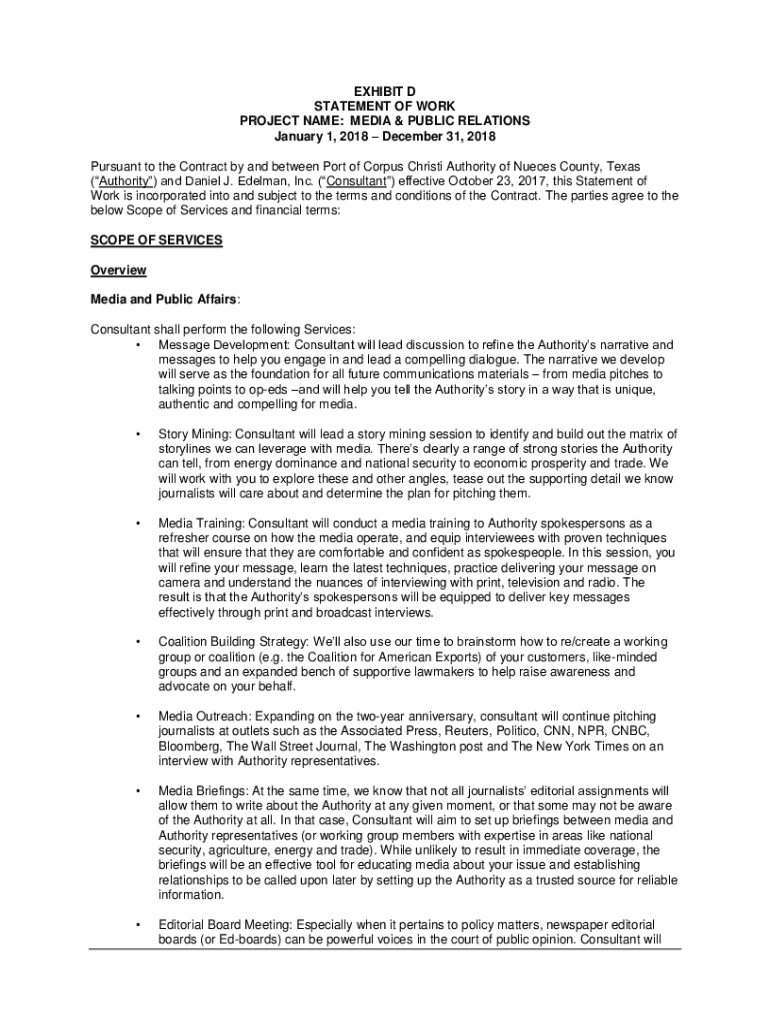 EXHIBIT D STATEMENT OF WORK PROJECT NAME: MEDIA & PUBLIC RELATIONS January 1, 2018, December 31, 2018, Pursuant to the Contract by and between Port of Corpus Christi Authority of Nueces County, Texas