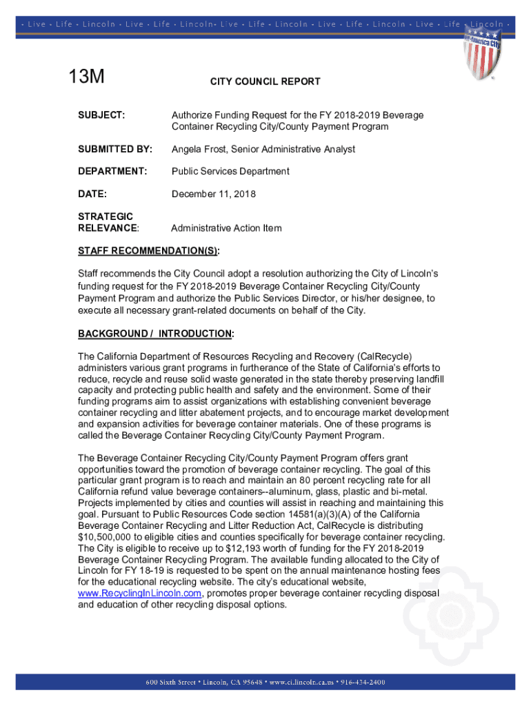 13MCITY COUNCIL REPORTSUBJECT:Authorize Funding Request for the FY 20182019 Beverage Container Recycling City/County Payment ProgramSUBMITTED BY:Angela Frost, Senior Administrative AnalystDEPARTMENT:Public