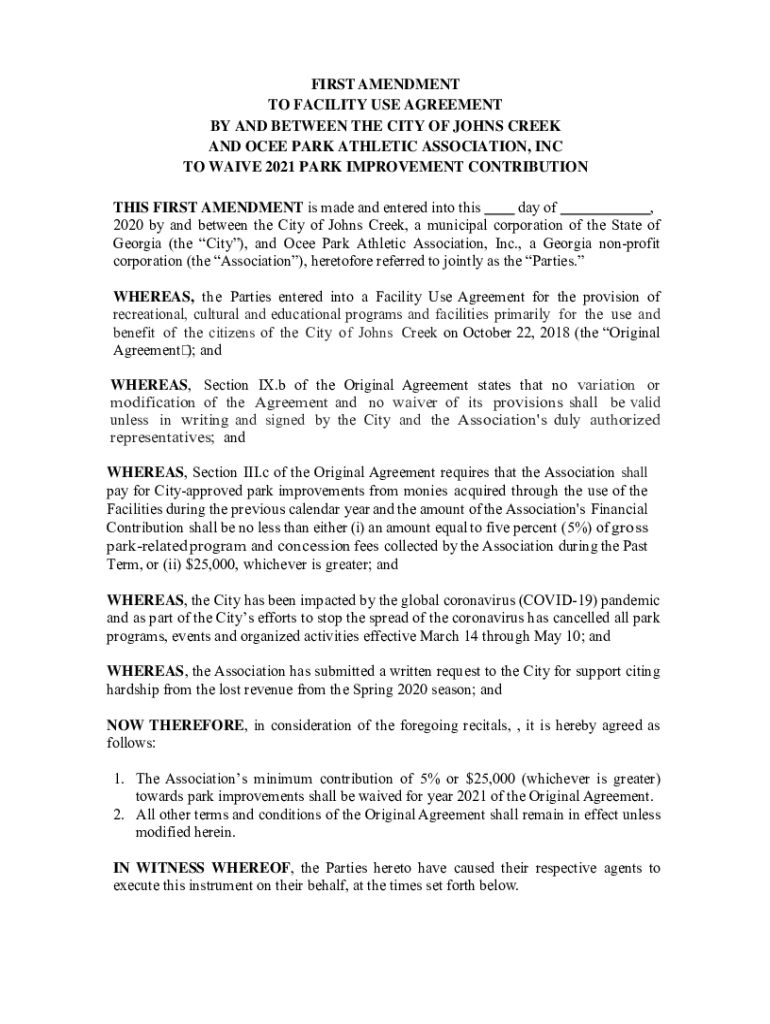 FIRST AMENDMENT TO FACILITY USE AGREEMENT BY AND BETWEEN THE CITY OF JOHNS CREEK AND CEE PARK ATHLETIC ASSOCIATION, INC TO WAIVE 2021 PARK IMPROVEMENT CONTRIBUTION THIS FIRST AMENDMENT is made and