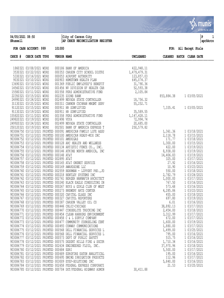 04/05/2021 08:50 Russell|City of Carson City |AP CHECK RECONCILIATION REGISTERED CASH ACCOUNT: 999|P 1 |apchkrcn101000FOR:All Except Spellcheck # CHECK DATE TYPE VENDOR NAME UNCLEARED CLEARED BATCH