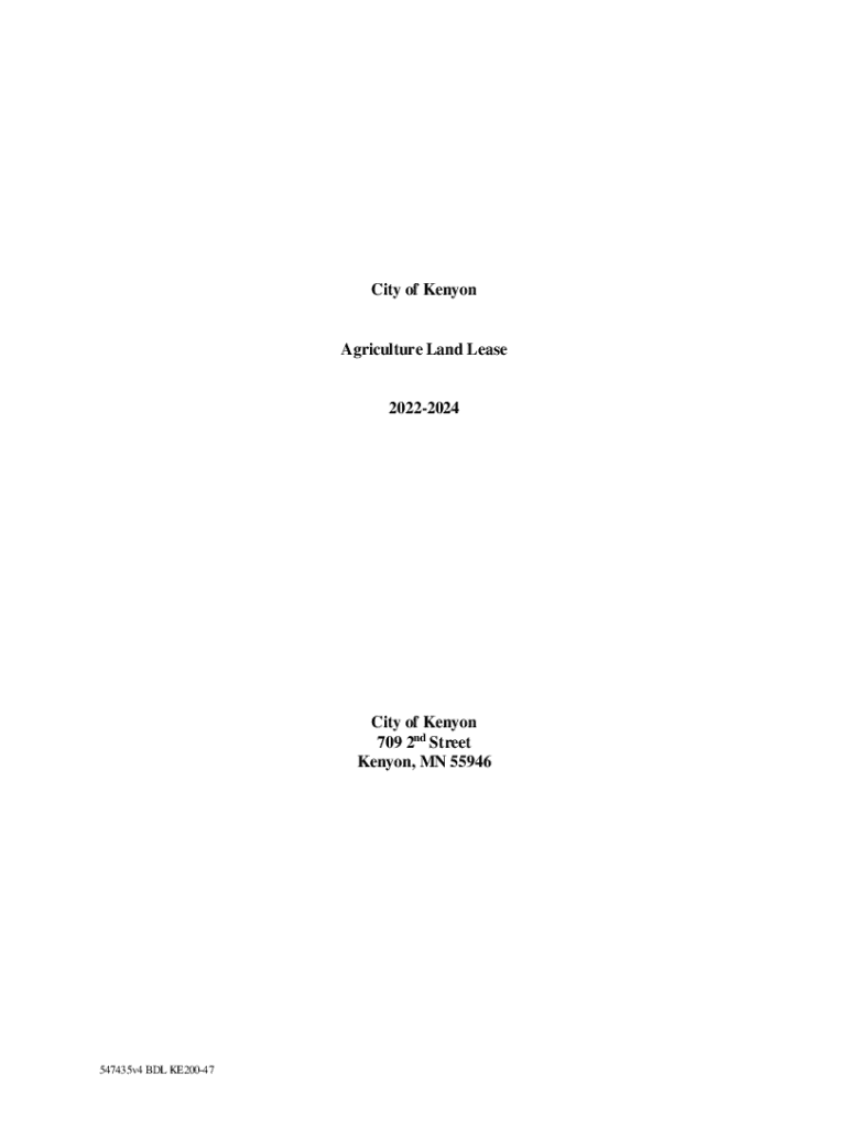 City of KenyonAgriculture Land Lease20222024City of Kenyon 709 2nd Street Kenyon, MN 55946547435v4 BDL KE20047AGRICULTURE LAND LEASE AGREEMENT THIS AGREEMENT, made this 1st day of January 2022, by