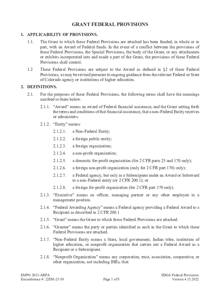 GRANT FEDERAL PROVISIONS 1. APPLICABILITY OF PROVISIONS. 1.1. The Grant to which these Federal Provisions are attached has been funded, in whole or in part, with an Award of Federal funds. In the