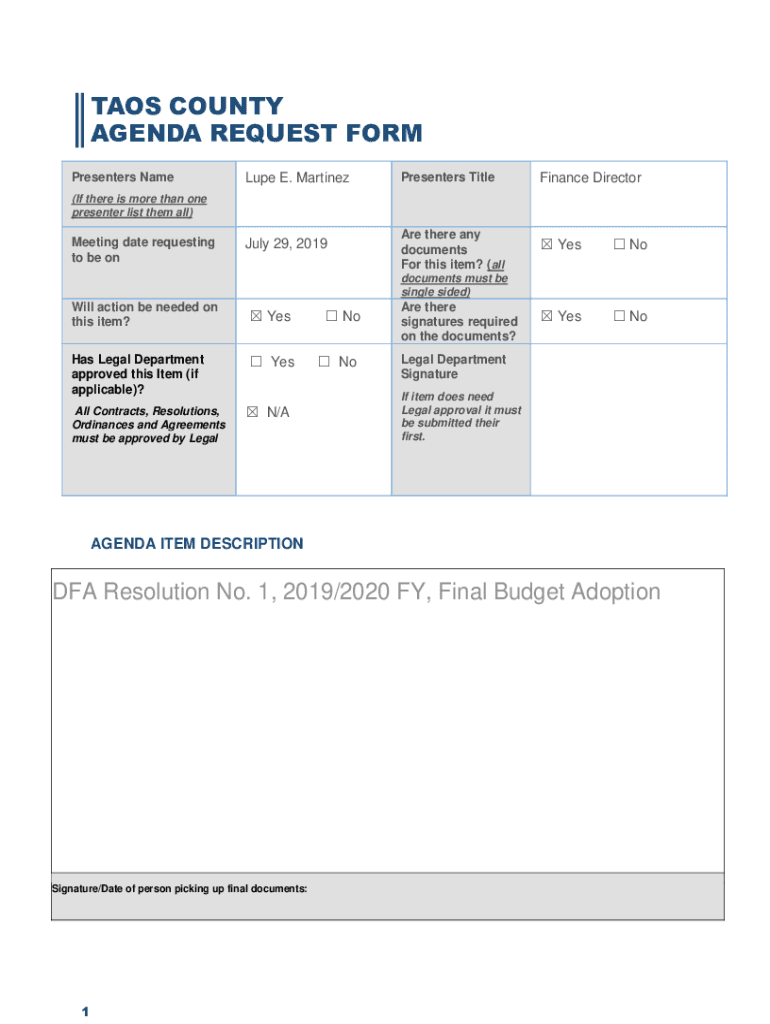 TAOS COUNTY AGENDA REQUEST FORM Presenters Name Lupe E. MartinezPresenters TitleFinance Director July 29, 2019Are there any documents For this item? (all Yes No(If there is more than one presenter