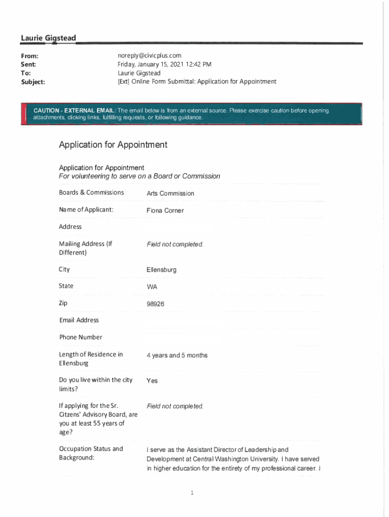 Laurie Gig stead noreply@civicplus.com Friday, January 15, 2021 12:42 PM Laurie Gig stead [Ext] Online Form Submittal: Application for AppointmentFrom:Sent: To:Subject:CAUTION EXTERNAL EMAIL: The